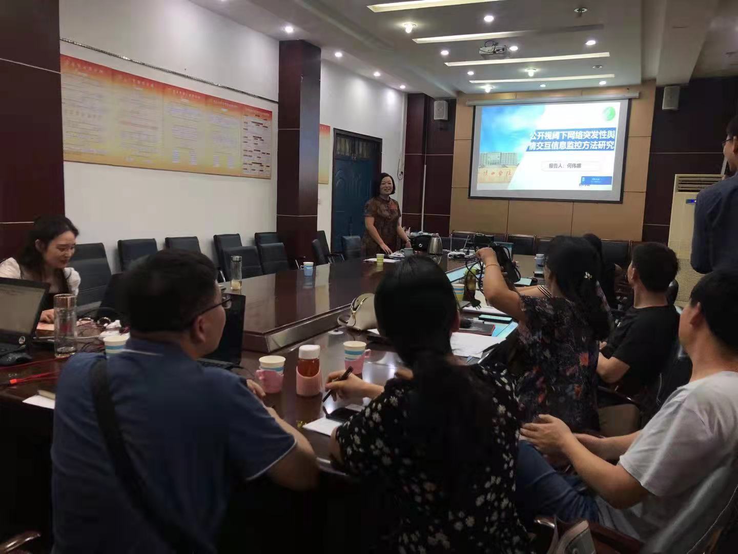 何伟娜老师以”公开视阈下网络突发性舆情交互信息监控方法研究“为主题,分享了在武汉大学访学一年来见闻、学习及科研情况。同时也寄语青年教师多出去走走看看,丰富学习阅历,增加知识积累。