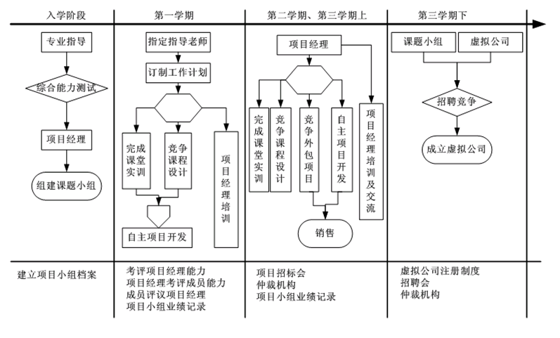 1-7课题组组建的工作流程如图2所示。其中,第一学期课题小组以课堂实训和课程设计的训练为主,部分能力较强的可以完成自主项目开发。对项目经理进行培训是本学期的关键工作。第二、三学期以项目经理为中心,开展外包项目和自主项目开发为主,并进行销售模拟。公司配合项目招标会和项目交流会模拟销售市场。同时对项目经理的培训以交流会为主。到第三学期下半学期开始允许虚拟公司和课题小组之间采用招聘、竞争等方式整合成立虚拟公司。成功的项目经理升格为虚拟公司经理。进入虚拟职场环境。所谓虚拟职场环境,实际上是在校内由公司提供支持,员工自发组织的模拟职业环境的员工社团环境,由通过课题小组模式优化升级为若干虚拟公司组成。每个虚拟公司为一个员工社团。内部按照IT公司管理模式建立,具有自己的技术特色和一定的市场潜力,并有一定的经营能力。该环境的建立可以解决员工岗位技能的培养和营销能力的提高,成为校内岗位实习基地。同时,也可以成为员工自主创业的基地。