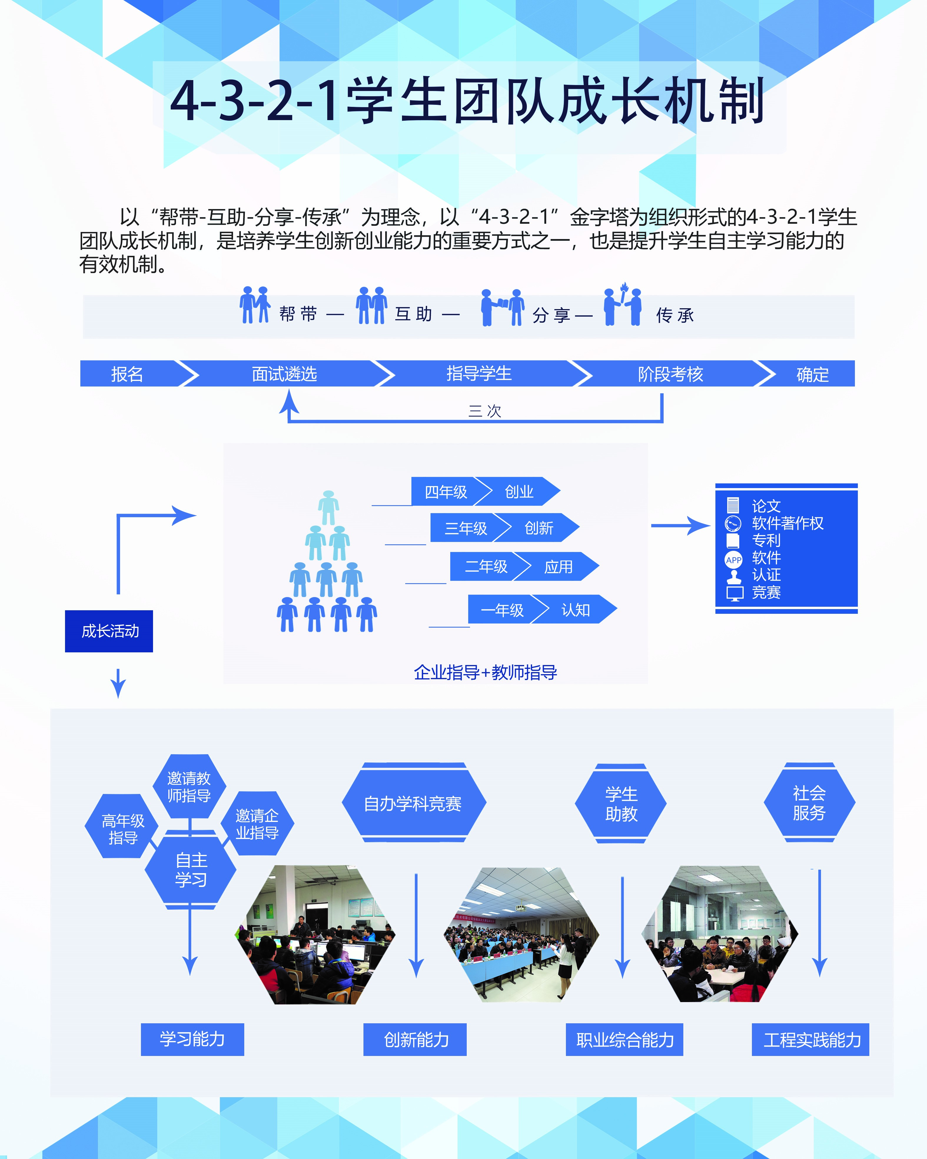 “4-3-2-1团队成长机制”是以“帮带-互助-分享-传承”为理念实施从四年级到一年级不间断的团队组织形式,该机制强化学习型团队内部的协同、帮带和成长,并通过行业对团队的互助机制和团队对在校员工的互助,形成基于“4-3-2-1团队成长机制”下的团队组织、学习、管理、成长和反哺教学的改革经验,促进团队成长与个人成长的统一。