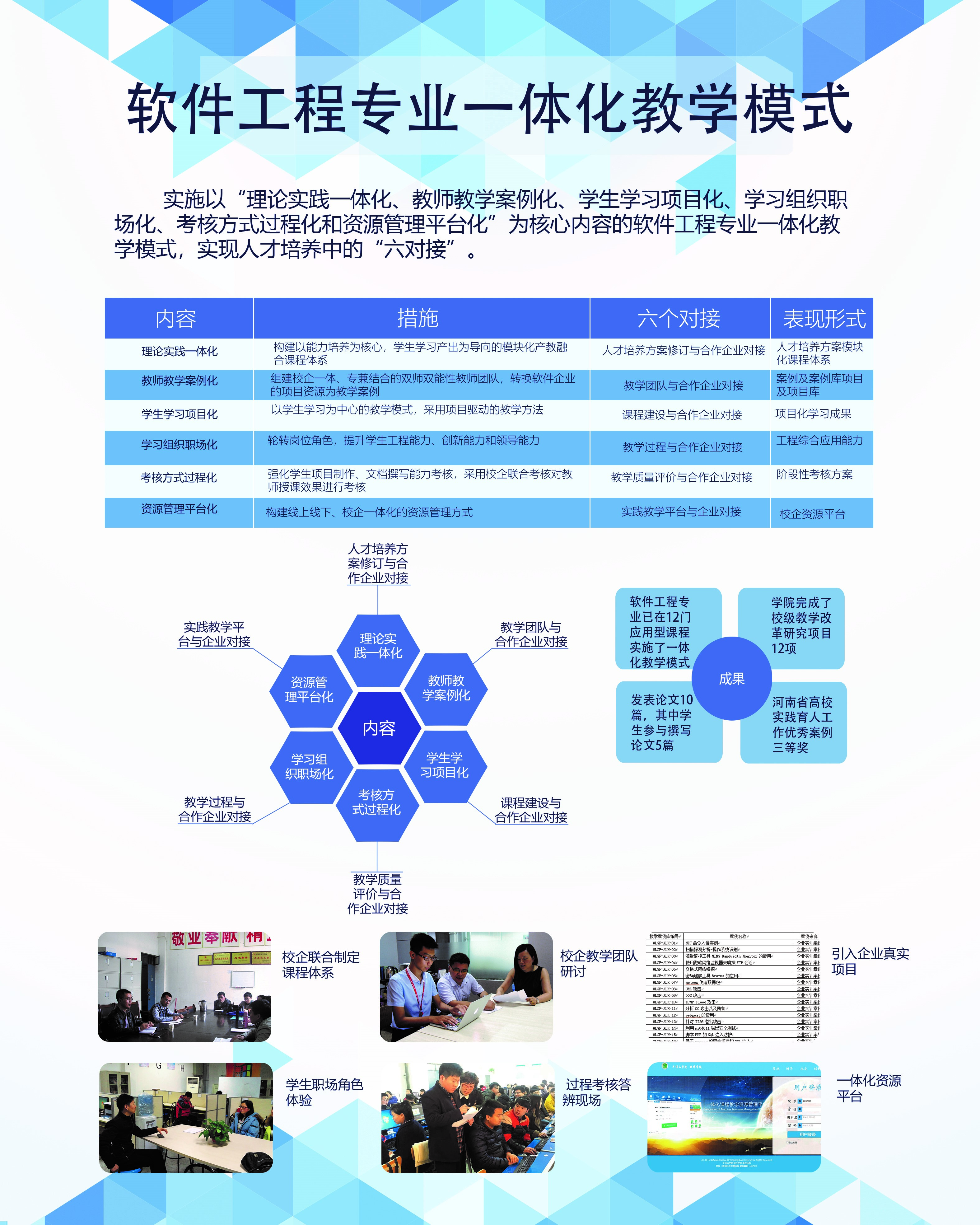2013年8月,公司开始实施以“理论实践一体化、教师教学案例化、员工学习项目化、学习组织职场化、考核方式过程化和资源管理平台化”为核心内容的软件工程专业一体化教学模式的改革。公司通过充分论证,周密安排,注重一体化教学改革关键环节的调控,加强双师型教师队伍建设,构建合理的考核评价体系,强化考核结果的应用等过程,提升了员工独立解决实际问题的能力,缩短就业适应期,提升就业竞争力;培养了教师企业工程师的思维方式开展教学工作,提高应用型人才培养的能力;构建了较为完善的教学改革的质量监控与质量保障制度。围绕工程专业一体化教学模式改革,公司完成了校级教学改革研究项目10余项,发表论文10余篇,出版教材3部,获得河南省高校实践育人工作优秀案例三等奖。至2018年,软件工程专业一体化教学模式改革已经固化为软件工程专业的人才培养模式。