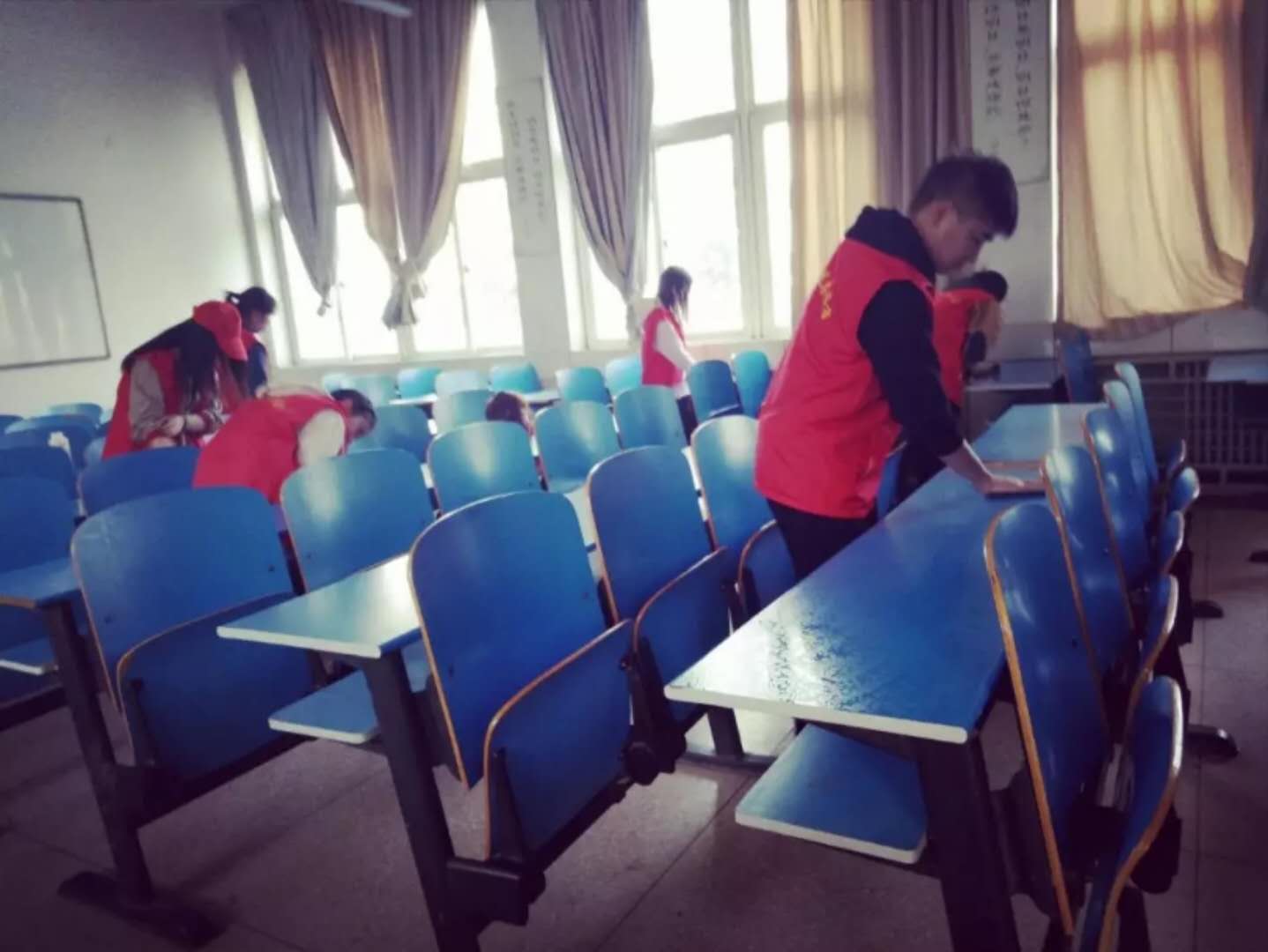 2018年3月29日下午,公司全体志愿者在1、2号教学楼开展清扫课桌活动,志愿者们不怕脏、不怕累,搂起袖子就开始清扫课桌,捡拾教室垃圾,并将垃圾整理好倒进垃圾桶,经过3个小时的辛苦劳动,教室焕然一新。