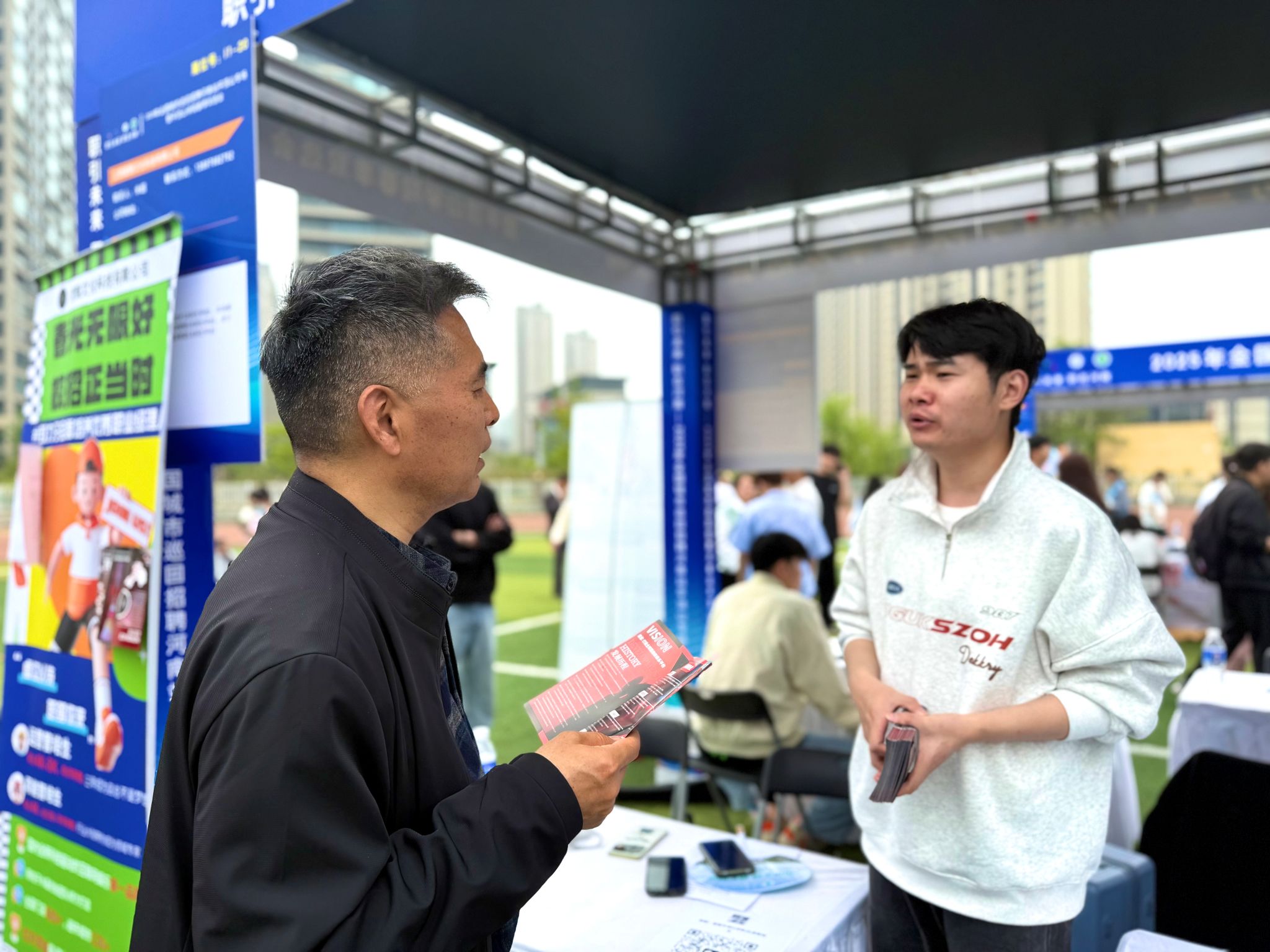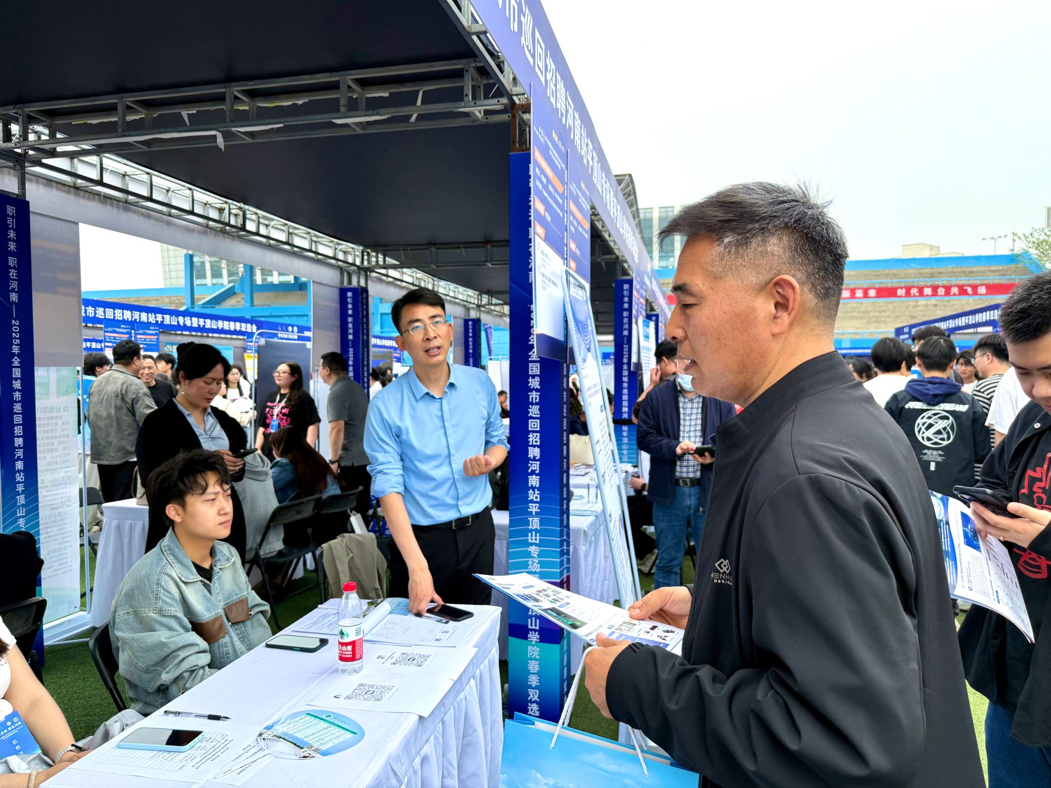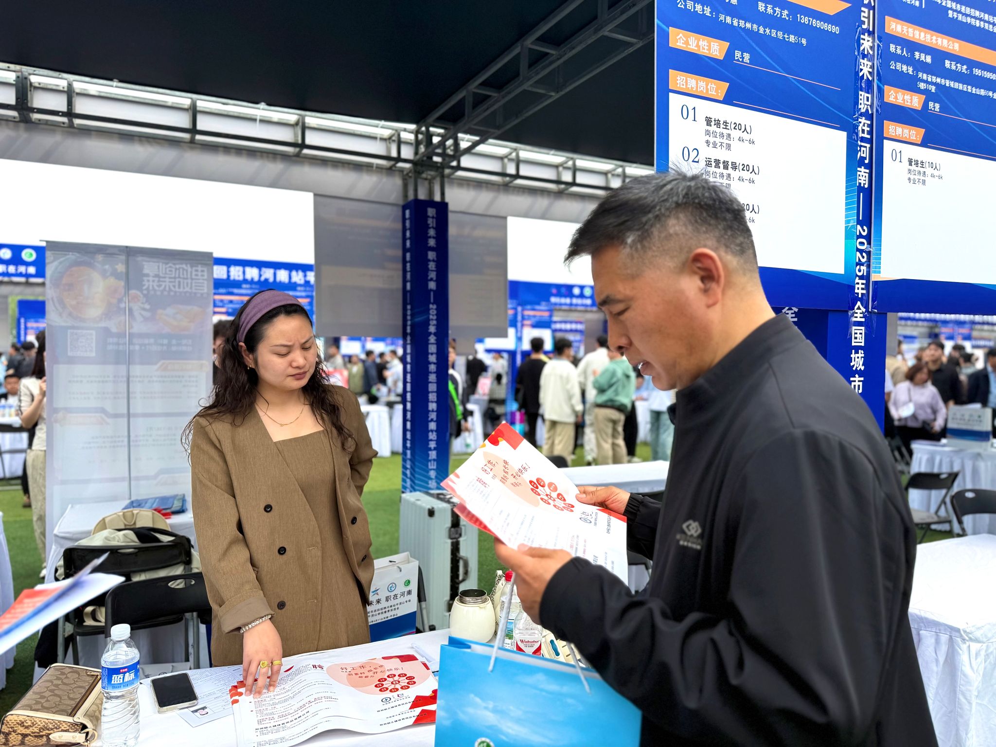 在招聘会现场,张书记逐一走访了河南旭纳企业管理咨询有限公司、千锋教育、旭端信息科技有限公司、河南网讯等30多家重点企业展位,详细询问岗位设置、薪资待遇及应聘者反馈。