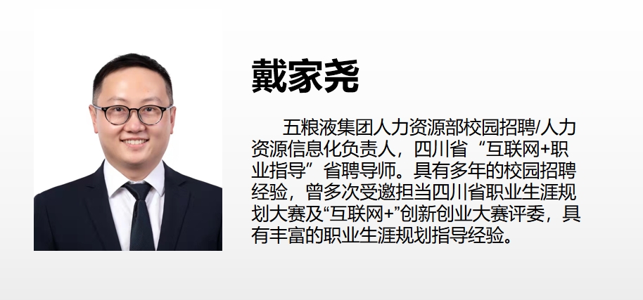2021年11月9日晚,公司邀请戴家尧先生为公司学子开展职业生涯规划座谈会。2018级全体员工及部分其他年级员工参与了此次讲座。戴家尧,五粮液集团人力资源部校园招聘/人力资源信息化负责人,四川省“互联网+职业指导”省聘导师。