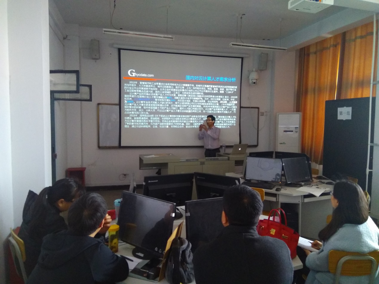3月21日下午2:30,网络教研室邀请北京高科云创公司技术人员李彦亮老师在科技楼412教室作了一场主题为《云计算专业发展趋势及人才要求分析》的报告。报告由网络教研室主任吕琼帅老师主持,网络教研室全体教师参加了此次活动。