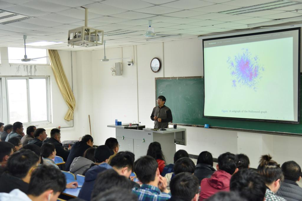张晓东教授首先从蛋白质的分子结构图和现实生活中的其它关系图产生的复杂网络入手,通过通俗的语言讲解了网络科学的定义和社团结构的概念,接着重点讲解了在任意网络类型中检测社团结构的最新方法和算法。张教授的报告将数学与计算机结合起来,阐述数学和计算机之间千丝万缕的联系,大大在地激发了同学们的学习兴趣,并对老师们的科研工作有很好的指导作用。报告结束后,张教授还与师生们进行了互动交流。