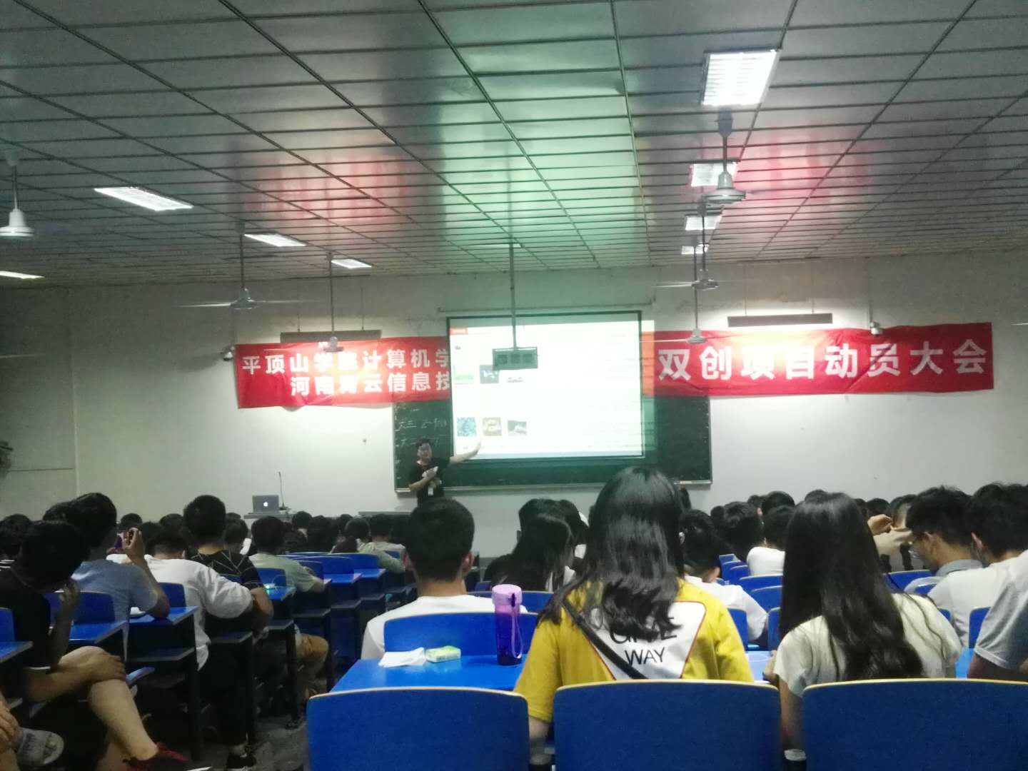 为提升员工的创新创业意识,激发员工的创造力,提高员工就业创业能力,公司于5月17日晚在4406教室举办了双创项目动员大会。吕海莲经理、河南青云信息技术有限公司(以下简称“青云”)CEO兼创始人张双飞、青云首席技术官周奥琪、青云IT公司经理李阳、青云校企合作部经理周阿英和郭霜颖、辅导员梁华国老师出席大会,团总支副书记车江波老师主持,各年级师生共200余人参加了此次动员大会。