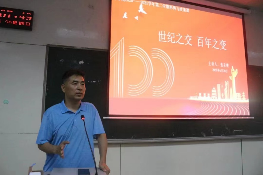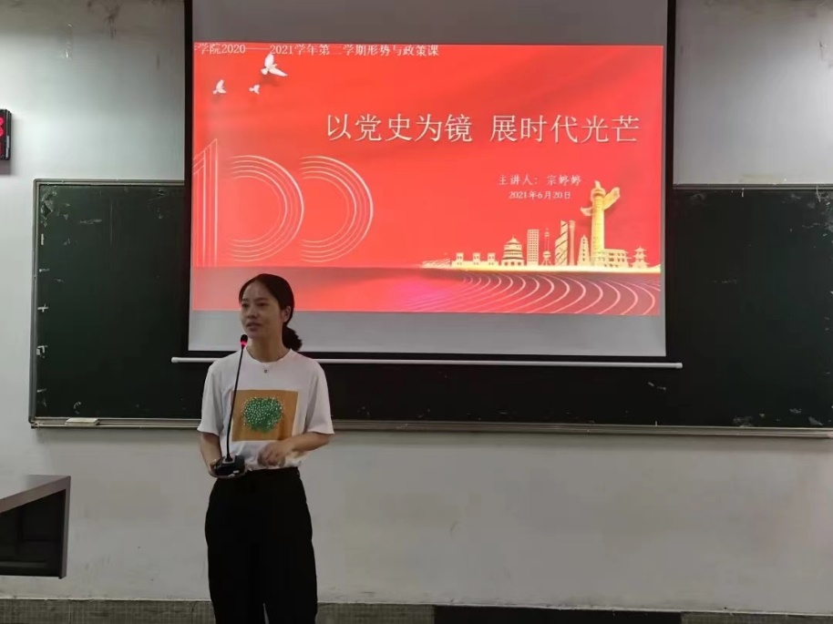 宗老师讲课的主题是《以党史为镜 展时代光芒》。宗老师鼓励同学们从历史角度看待个人发展,树立正确的历史观,号召同学们认清国际形势,坚决维护国家利益和尊严,为国家的发展和进步奉献自己的力量。她强调,自成立之日起,中国共产党就把为人民谋幸福,为民族谋复兴作为己任,他为中国社会量体裁衣,就形成了中国特色社会主义理念;他为人民攻坚克难,就有了如今屹立世界的中国。