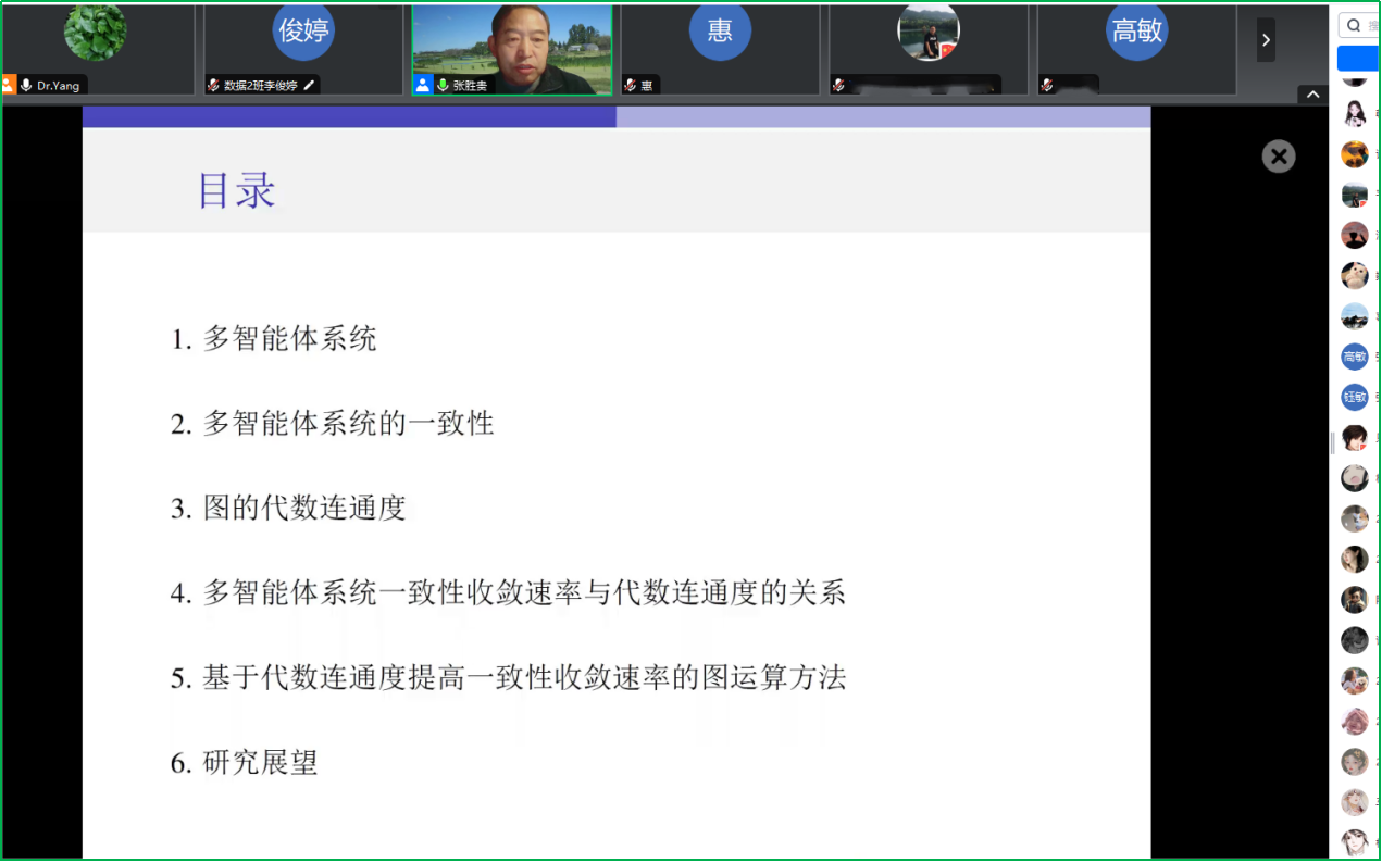 12月13日晚,应beats365唯一官网的邀请,西北工业大学博士生导师张胜贵教授为公司师生作了题为《多智能体系统的一致性与图的代数连通度》的线上学术报告。beats365唯一官网、信息工程公司和数学与统计公司等相关院系的师生以及联合培养研究生参加了报告会。