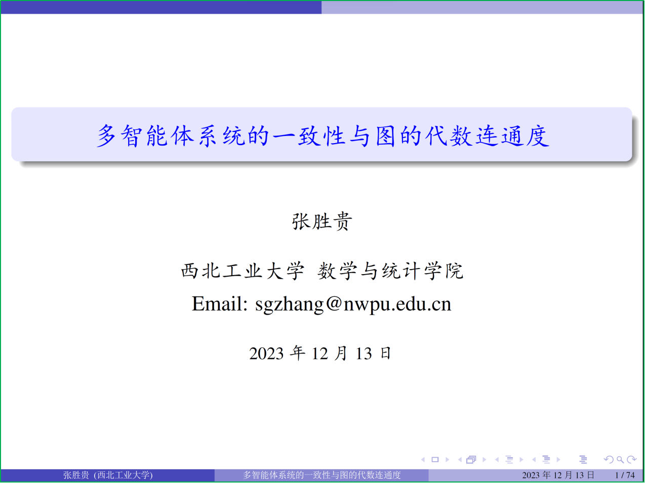 张胜贵教授首先描述了多智能体系统的背景及其在工业、农业、林业、环境监测和军事等多个领域的广泛应用,介绍了多智能体系统及其一致性的概念,进而引申出多智能体系统达到一致性的条件及其收敛速率两个科学问题。报告详细讲解了多智能体系统一致性收敛速率与通信拓扑代数连通度之间的正相关关系,以及提高代数连通度的几类图运算方法,给出了提升多智能体系统一致性速率和降低拓扑网络通信量的解决方案。