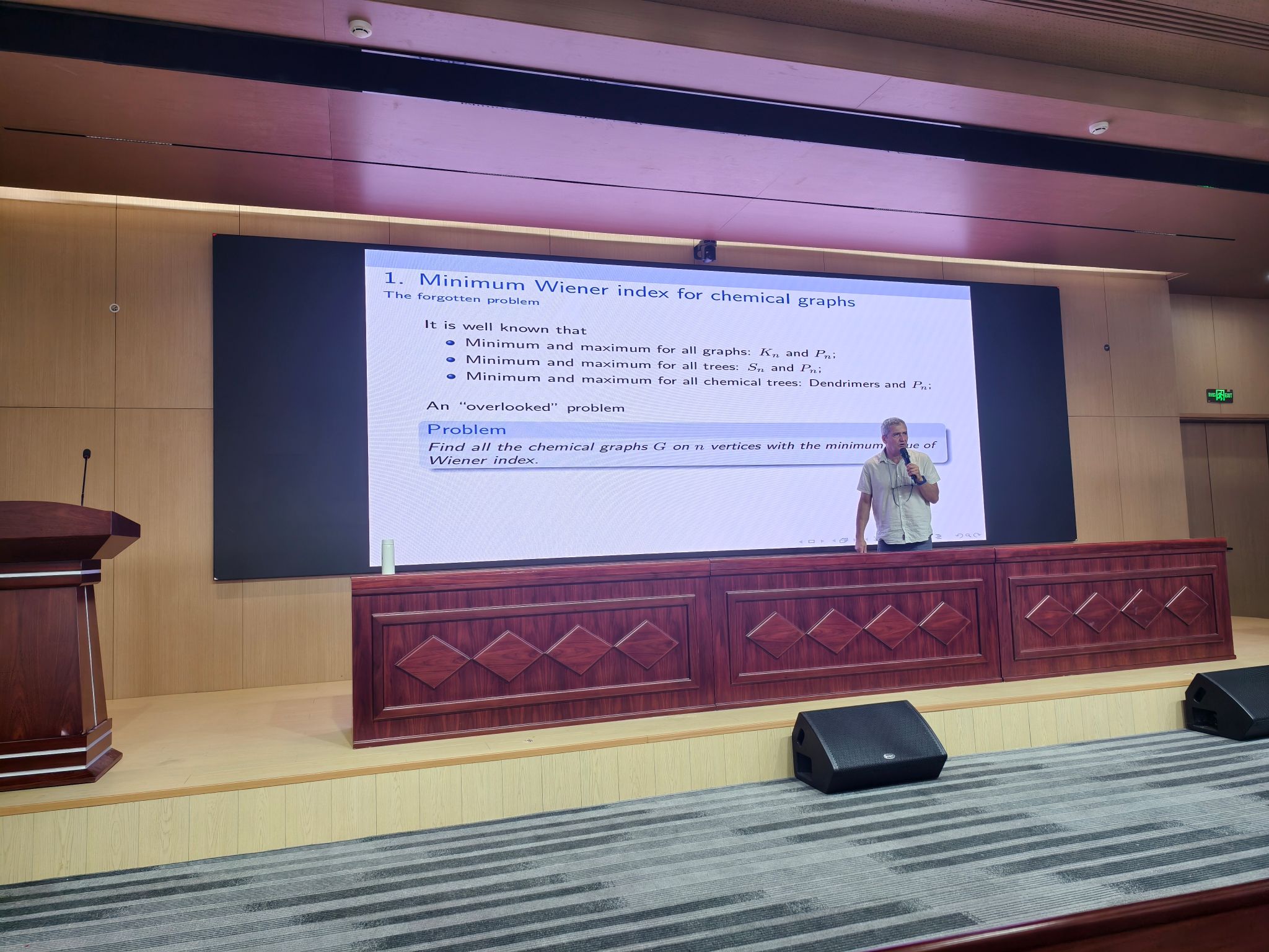 Škrekovski教授作为国际图论与复杂网络研究领域的权威专家,系统介绍了维纳指数的理论基础和研究进展。维纳指数作为重要的分子拓扑描述符,在预测化合物性质方面具有广泛应用。Škrekovski教授重点阐述了维纳极值问题的解决方案,以及图结构性质与指数极值之间的相互作用机制。他还分享了团队在权威期刊《Ars Mathematica Contemporanea》上发表的重要研究成果。